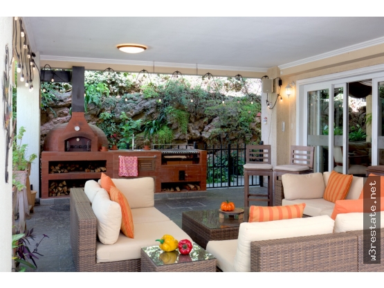 • Área social exterior techada, equipada con horno de leña, churrasquera, lavatrastos y bodega. Cortinas enrollables, techo retráctil y acceso independiente